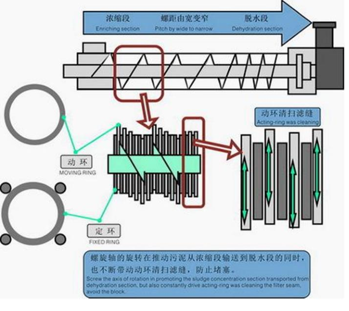 3、自清洗:螺旋軸的旋轉(zhuǎn),推動(dòng)游動(dòng)環(huán)不斷轉(zhuǎn)動(dòng),設(shè)備依靠固定環(huán)和游動(dòng)環(huán)之間的移動(dòng)實(shí)現(xiàn)連續(xù)的自清洗過(guò)程,從而巧妙地避免了傳統(tǒng)脫水機(jī)普遍存在的堵塞問(wèn)題。